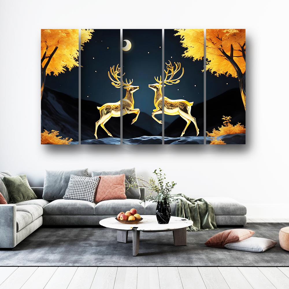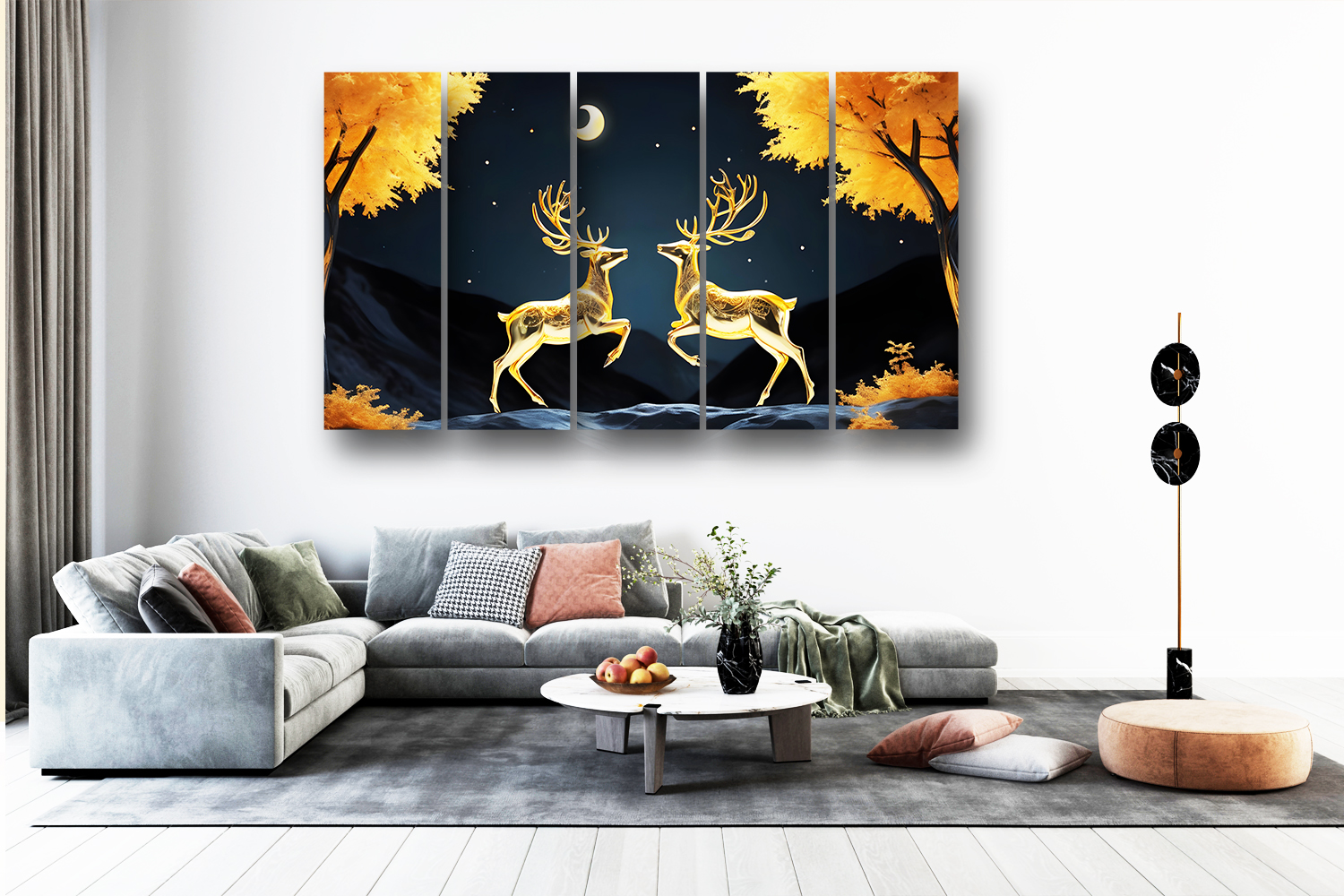 Casperme Golden deer Wall Painting Framed Big Size For Living Room, Home, office & Wall Decor, 48 x 30 inches set of 5