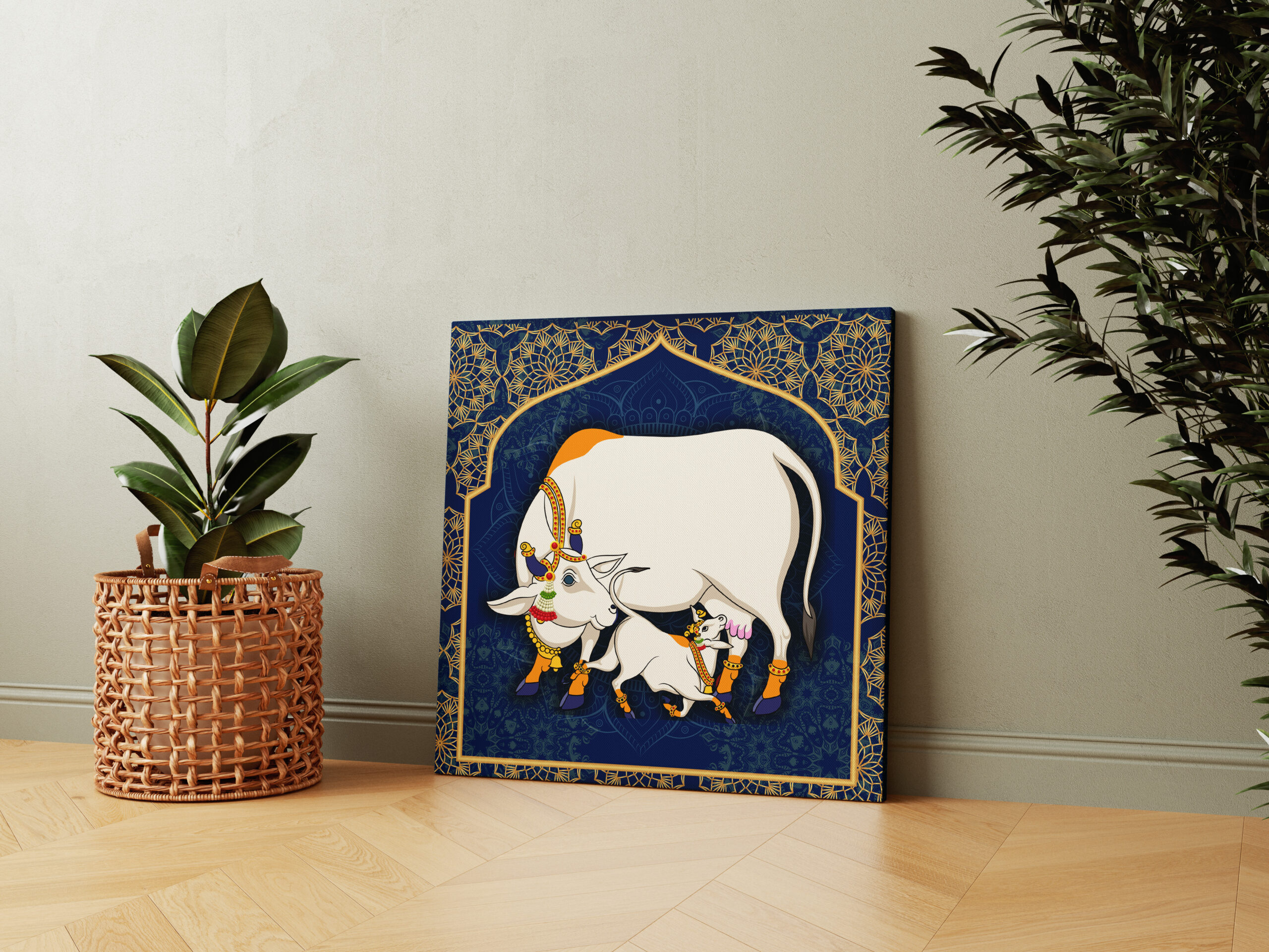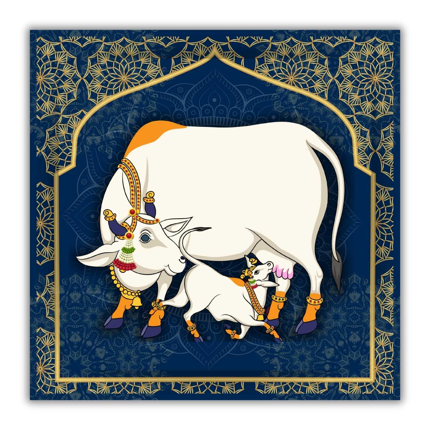 Our Kamdhenu Cow Wall Paintings Big Size for Living room are Made from durable, fade-resistant 360 GSM imported cotton canvas for vibrant, long-lasting prints with brilliant tones.